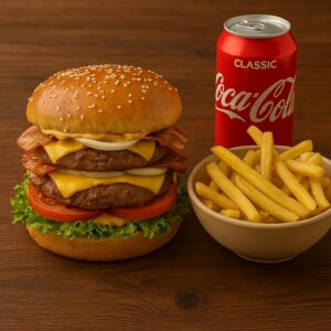 2 Steaks maison, salade, tomates , bacon,oignons , cheddar, sauce maison