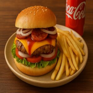 2 Steaks maison, salade, tomates , bacon, œuf,oignons , cheddar, emmental, sauce barbecue