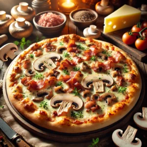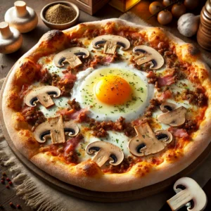 Sauce tomate, fromage, boeuf haché, champignons,oeuf