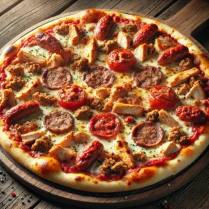 Sauce tomate, fromage, viande hachée, poulet, merguez