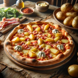 Sauce tomate, fromage, jambon, pommes de terre,chèvre