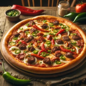 Sauce tomate, fromage, merguez, oignons, poivrons, olives, oeuf