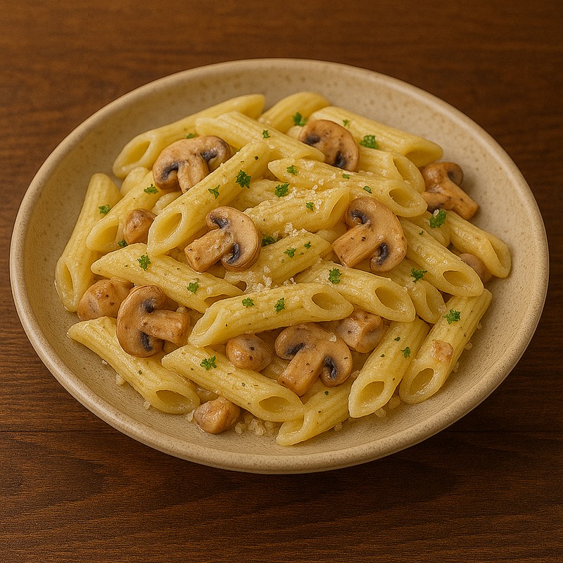 Penne, crème, émincé de poulet,champignons, parmesan.