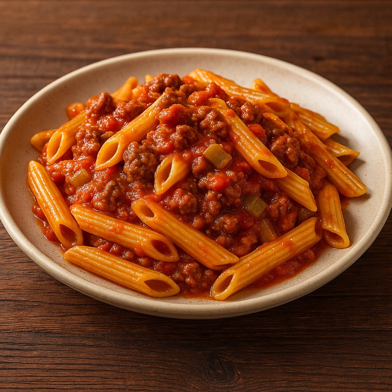 Penne, sauce tomate, bœuf mijoté,oignons, céleri.