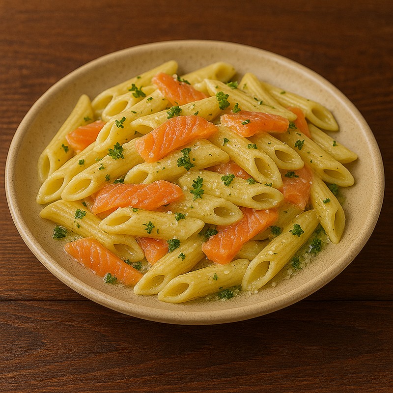 Penne, crème, saumon fumé, persil, ail, parmesan.