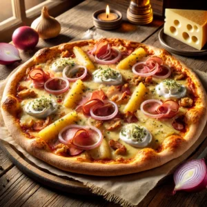 Sauce tomate, fromage, jambon, pommes de terre,chèvre