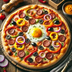 Sauce tomate, fromage, merguez, oignons, poivrons, olives, oeuf