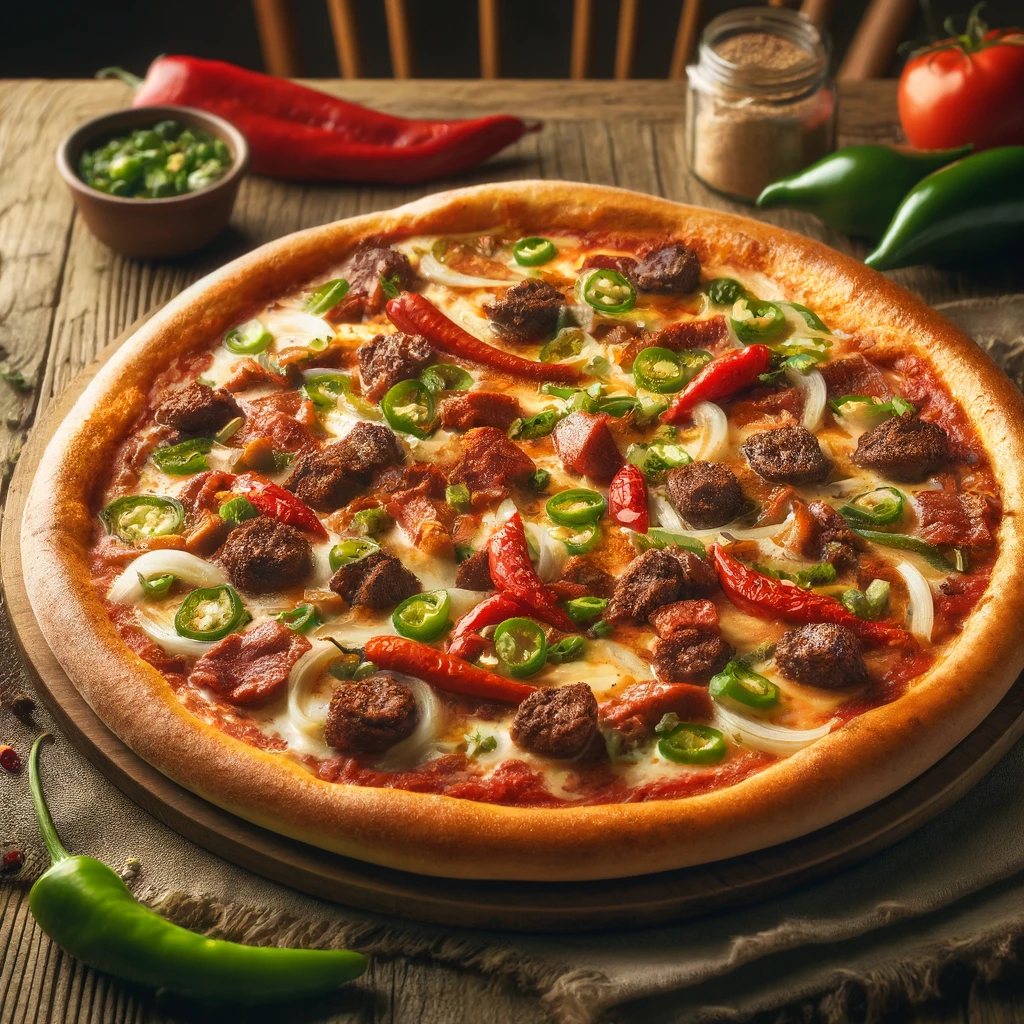 Sauce tomate, fromage, jambon, poivrons, oignons, chèvre