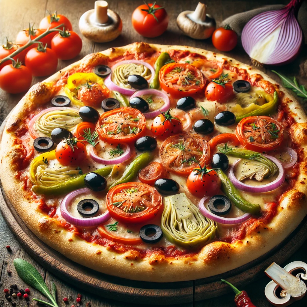 Sauce tomate, fromage, champignons, poivrons, artichauts, oignons, pommes de terre, olives