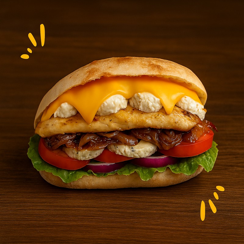 Pain maison, escalope de poulet, boursin, emmental, chèvre,sauce fromagère, salade, tomates, oignons caramélisés